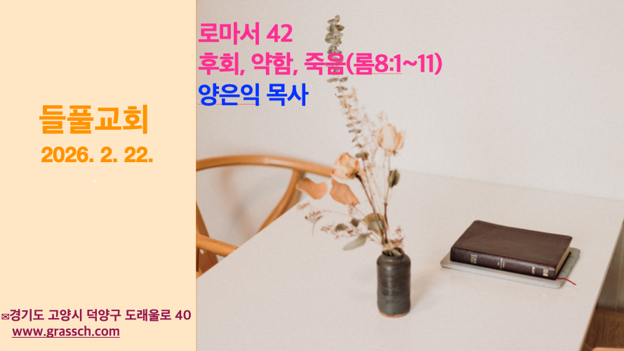 로마서42: 후회. 약함. 죽음(롬8:1~11) 오늘 말씀의 제목은 후회, 약함, 죽음이라는 세 단어입니다. 원하지 않는데 찾아오는 불청객 같은 단어들입니다. 피할 수 있으면 피하고 싶지만, 생각만큼 잘 되지 않는 삶의 현실이 이 단어들에 배어 있습니다. 뒤를 보며 후회하고, 안을 들여다보며 약함에 떨고, 앞을 내다보며 불안해합니다. 오늘 본문은 우리의 과거와 현재, 미래를 향해 동시에 말씀합니다. 이 세 […]