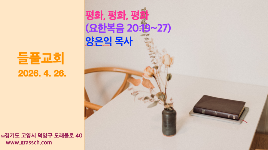평화, 평화, 평화 (요 20:19~27) 1. 세 번의 평화. 오늘 말씀 제목은 ‘평화’입니다. 한 번이 아니고 세 번입니다. 평화, 평화, 평화. 왜 세 번을 썼을까요? 너무 귀해서 강조하려고 세 번을 쓴 것도 있지만, 오늘 본문에 세 번이나 등장하기 때문입니다. 요한복음 20장 19절, 21절, 26절에 나옵니다. 개역개정에는 ‘평강’으로 나오지만 사실 ‘평화’라는 뜻입니다. 헬라어로는 에이레네, 히브리어로는 […]